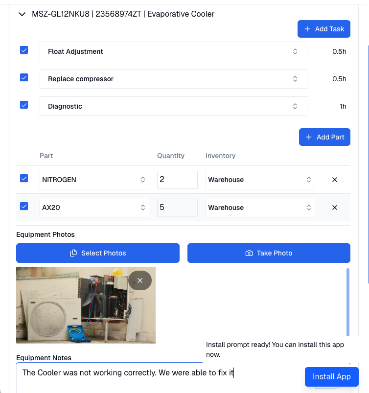Before heading out for a new assignment, they can see any purchase orders for that job and mark parts as picked up. The app shows equipment history, so technicians can see what issues came up before and diagnose problems faster. Most of their work happens in the app — they rarely need to contact the office.